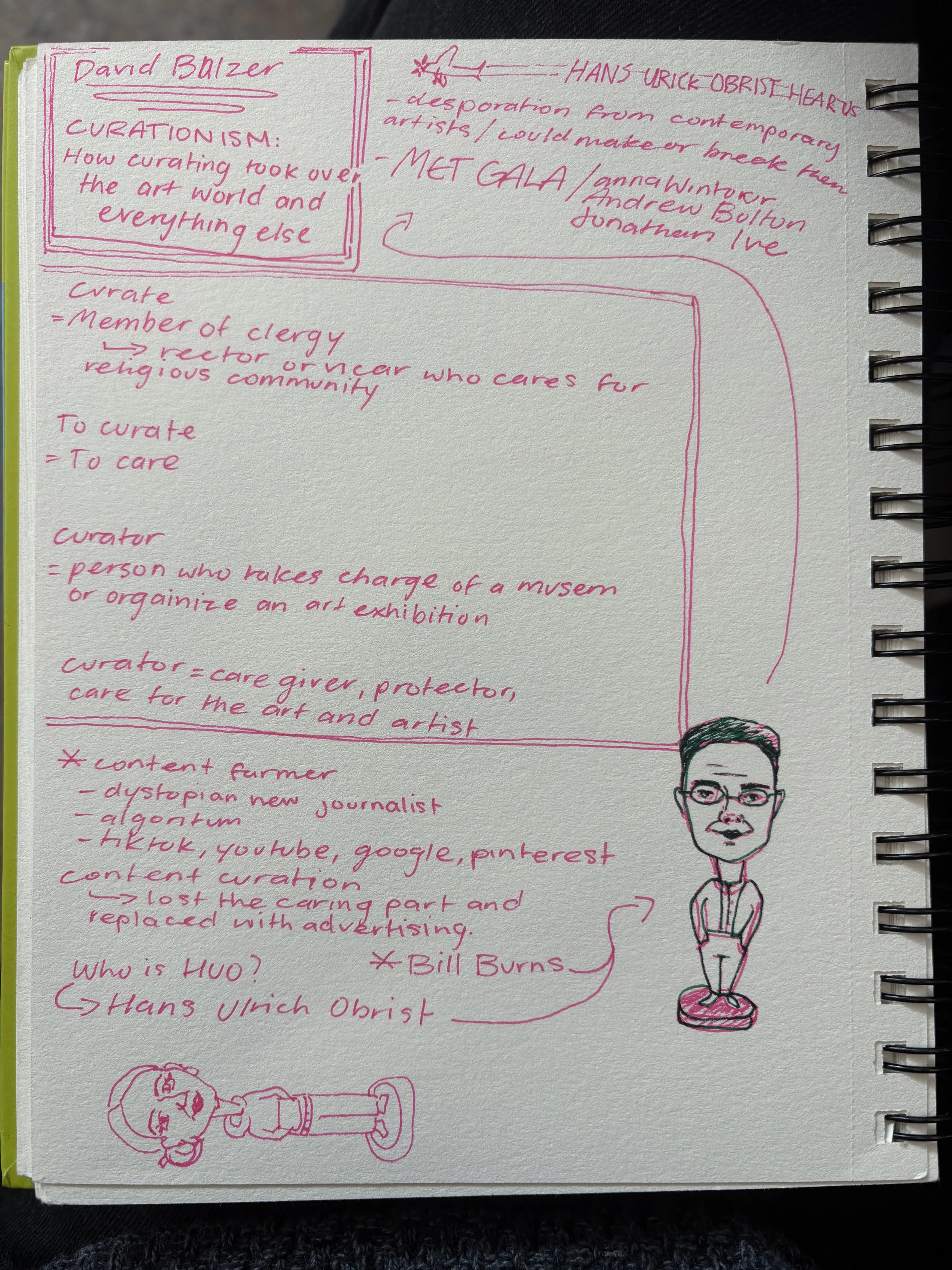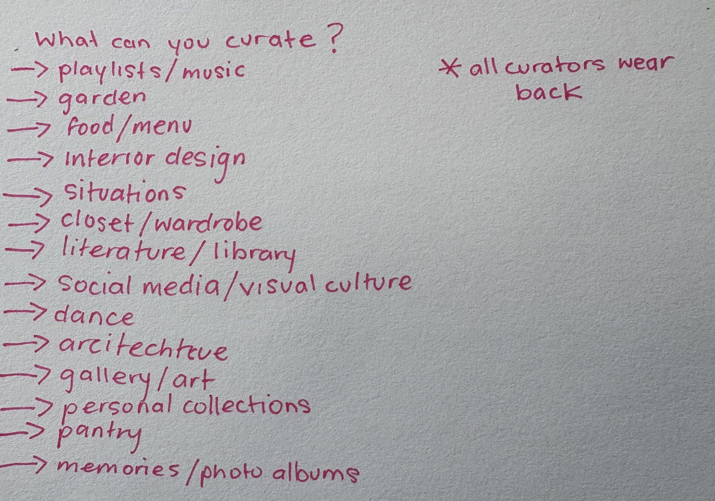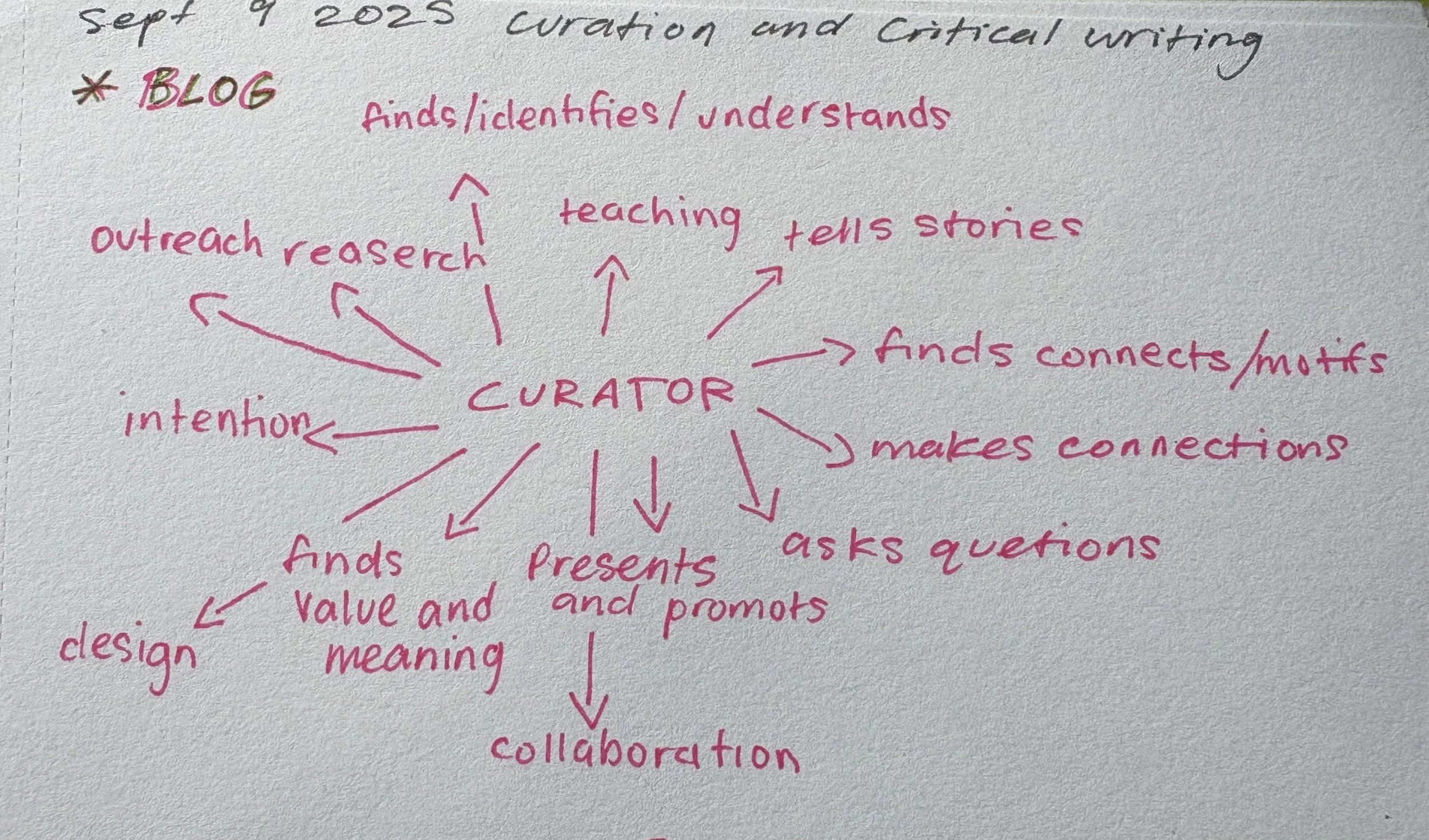 Today in class, we were split into groups and given two questions, 1. What does a curator do? and 2. What can be curated? We were given a few minutes to brainstorm and write out answers down on the white boards. Then we went around the room and told the class our ideas, these are the notes I took as everyone shared: