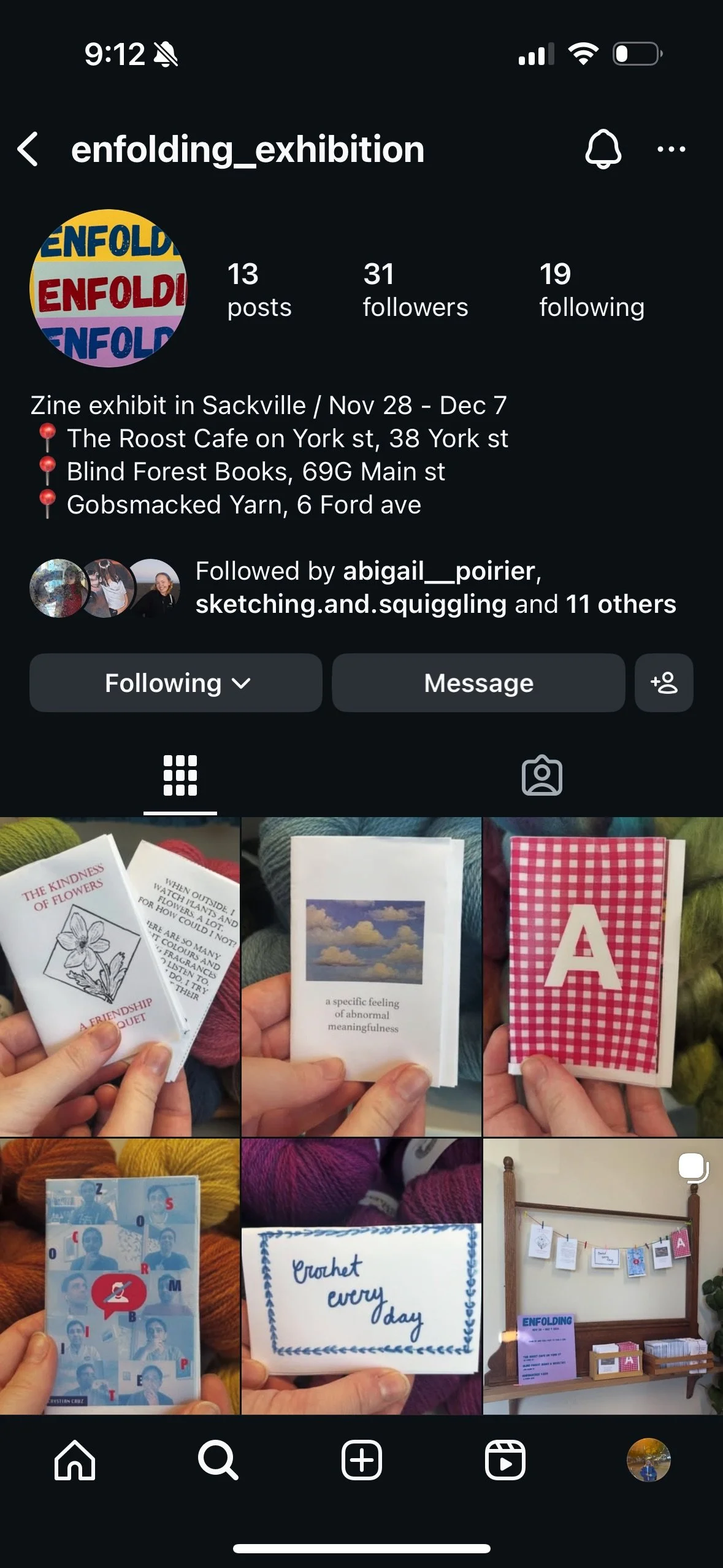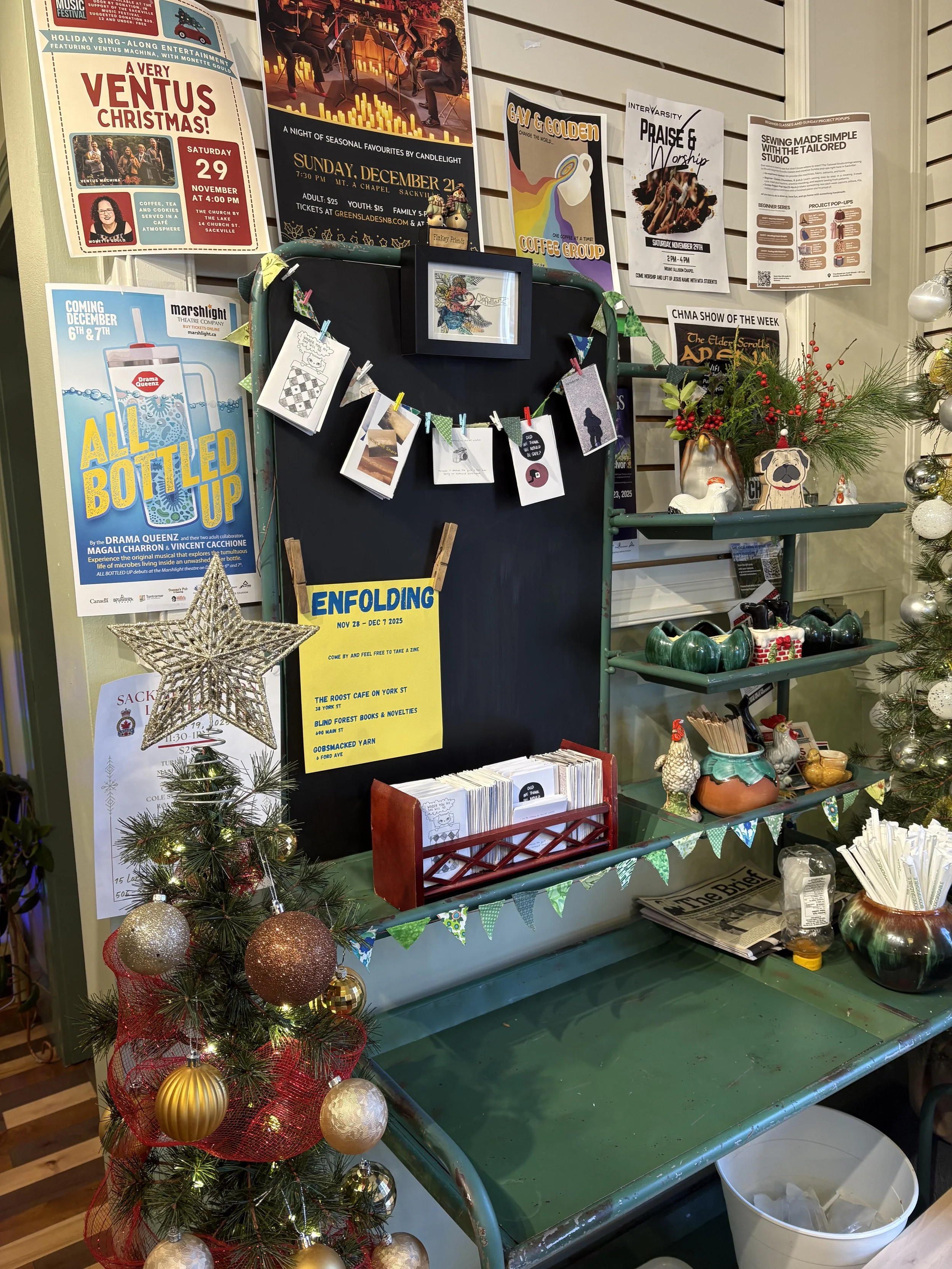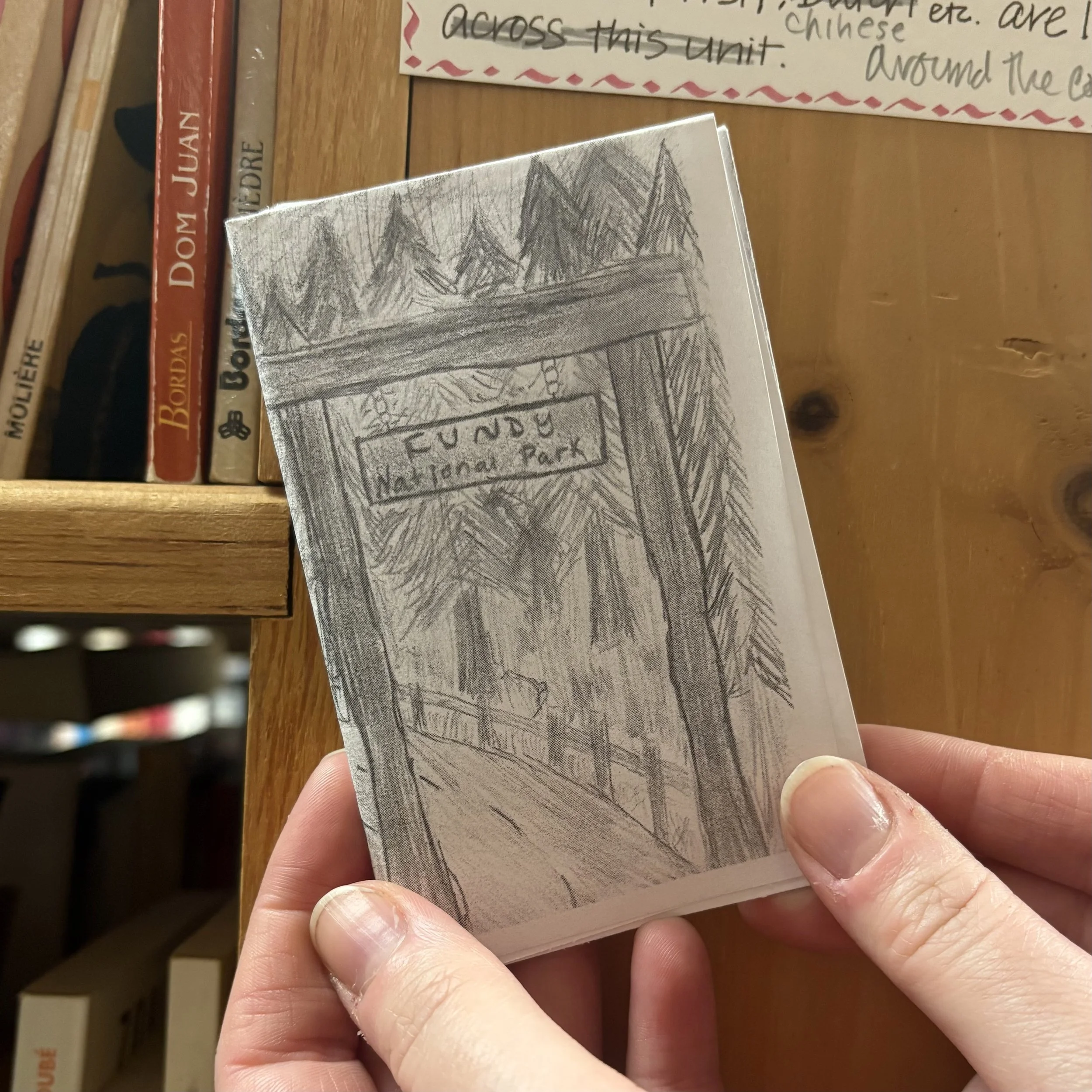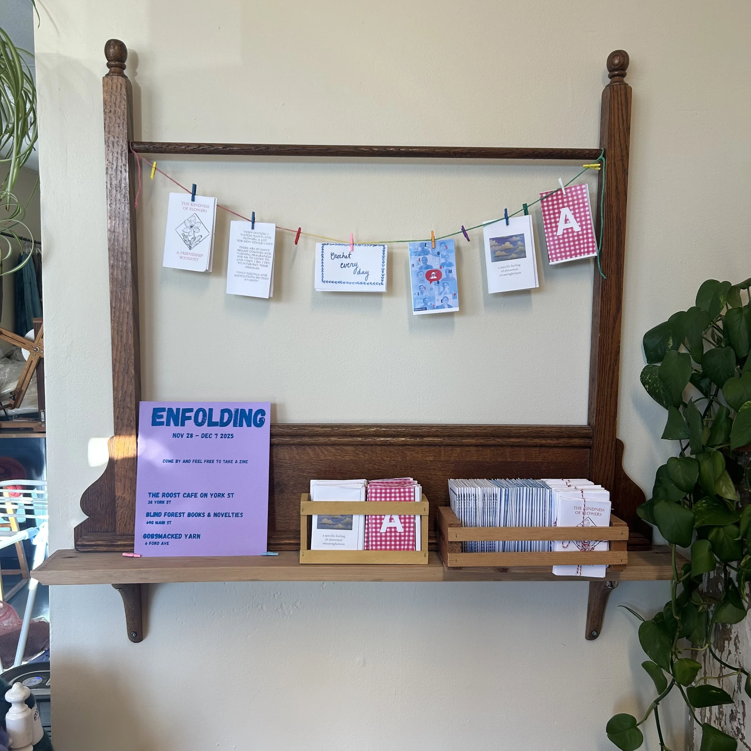 Out of love for the ideas that zines represent, and in response to disconnection, the curators of Enfolding will set up an exhibition, spotlighting work by local student artists as well as zine-makers from across different communities. Copies of the artists' works will be displayed in cases or shelves for visitors to borrow or take. This exhibition will live in 3 venues, all of which are important and cherished 'third spaces' of Sackville; The Roost Café, Blind Forest Books, and Gobsmacked Yarn. At each venue, viewers will be invited to visit the other locations and piece the full exhibition
